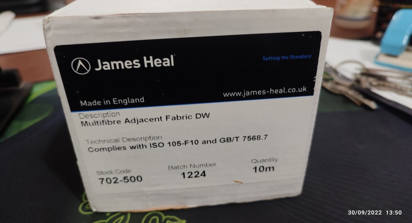 The JAMES H.HEAL Multifibre DW multi-fiber interlining fabric is used as a standard interlining fabric in the color fastness test.